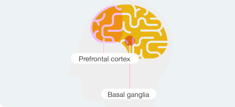 In children with ADHD, the prefrontal cortex and the basal ganglia in the brain, along with certain other areas, are different from those without ADHD. Two chemical messengers or neurotransmitters – noradrenaline and dopamine – normally connect the prefrontal cortex and the basal ganglia. Lower levels of these messengers result in poor connections between these areas leading to the altered brain functioning found in people with ADHD.