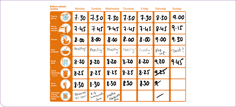 We all like visible signs of our progress and improvements. So why not draw up a chart with your child showing what you expect in the new routine, how long you expect it to take and how your child has done over a week or a month? Maybe even set up a spreadsheet on the home computer or keep notes on your smartphone. Make sure that your child is involved and buys into the new routine.