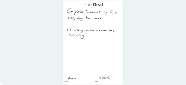 Contracting is about talking to your child about the right way to behave, and agreeing a plan together, with rewards for them when they do what they are asked. The contract – ‘The Deal’ – can be written down and it is essential for the child to agree the behaviour change – if they think it is their idea they are far more likely to stick to it. The contract should be specific, appropriate and sustainable over the long term. Agree the reward you are going to give to your child in advance and make sure it is appropriate to the change you want and that your child is motivated by the reward. Ideas for contracts or ‘deals’ could include getting up on time five mornings in a row, tidying their room every day, doing their homework for ten minutes every night and so on.