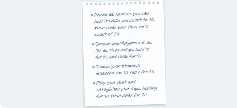 - This could be finding somewhere that’s quiet and comfortable, laying down on your back (or standing with your back against a wall) and closing your eyes. Then do some or all of these two or three times: